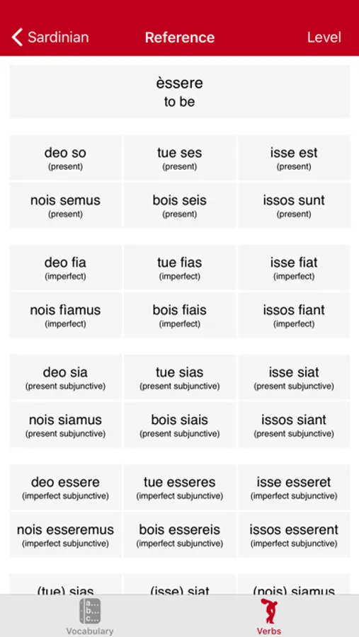• Verbs: Tests your ability to parse and to conjugate a range of representative regular and irregular Sardinian verbs.