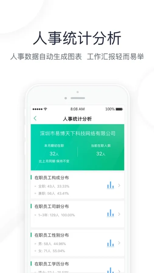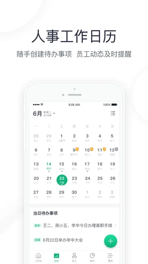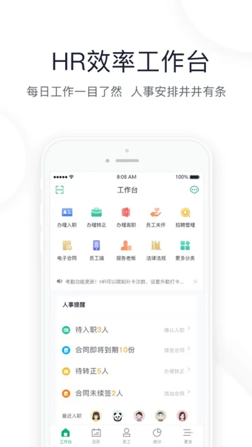 ● 每日工作一目了然,所有待办事项、今日招聘、人事统计、人事动态尽在掌握,助你高效完成管理工作