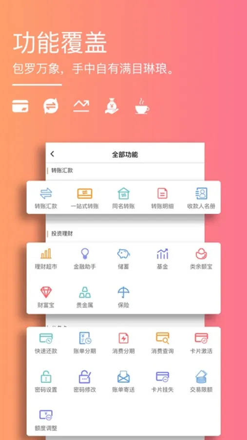 目前,我行推出了各款自营理财产品、代销理财、财富宝、类余额宝、代销基金、贵金属、消费贷,以及公务卡的更贴心服务,更多内容,请下载应用体验。