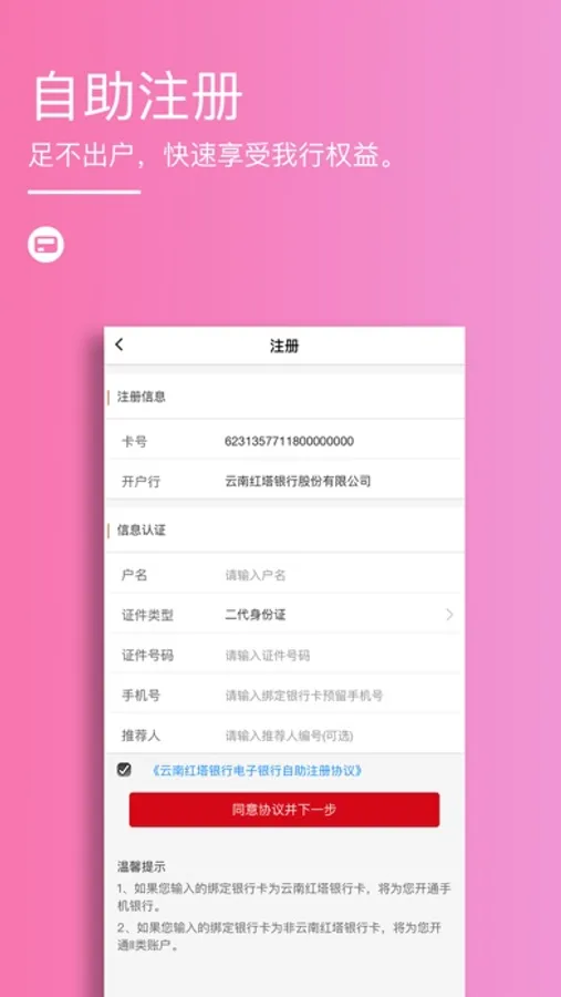 借助二三类账户实现的电子账户为您提供自助注册功能,不必到柜台网点,快速开设云南红塔银行二类账户,立享理财基金、财富宝、贵金属、保险、网贷等多种我行提供的特色服务。