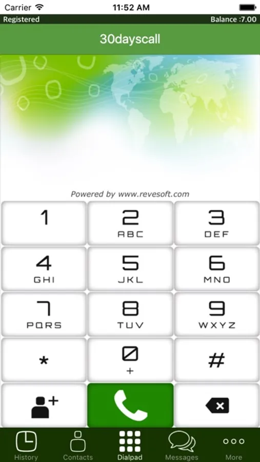 3. Launch 30dayscall and dial destination number using any of the Dial formats or directly from Contact list.