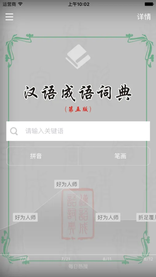 原版内容,正版发行。全国优秀畅销书,《汉语成语词典》2014年1月第5版第9次印刷手机版同步发行,由长期从事语言文字教学与研究的专家、学者编写,是一本适合中等文化程度的读者使用的优秀中型成语词典。