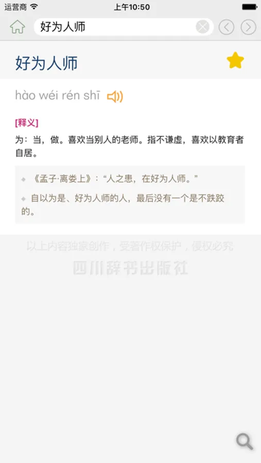 海笛科技携手四川辞书出版社官方权威正版发布,具有手机上便捷的查询功能,还有清晰发音、收藏复习等辅助学习功能。选择正版词典,学习更有保障!(版权所有,盗版必究)