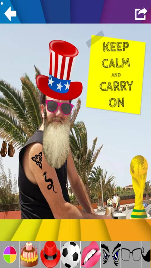 The sticker collection includes Xmas items, hats, sports props, mouths, eyes, glasses, moustaches, beards, masks, shirts, skirts, halloween stickers, tattoos, badges, quotes and frames!