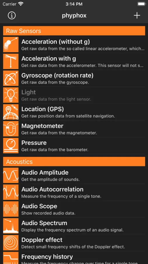 phyphox gives you access to the sensors of your phone either directly or through ready-to-play experiments which analyze your data and let you export raw data along with the results for further analysis. You can even define your own experiments on phyphox.org and share them with colleagues, students and friends.