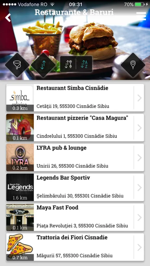 Toate elementele pot fi sortate alfabetic sau dupa distanta. De asemenea, se pot folosi optiuni de filtrare, in functie de tipul de punct de interes.