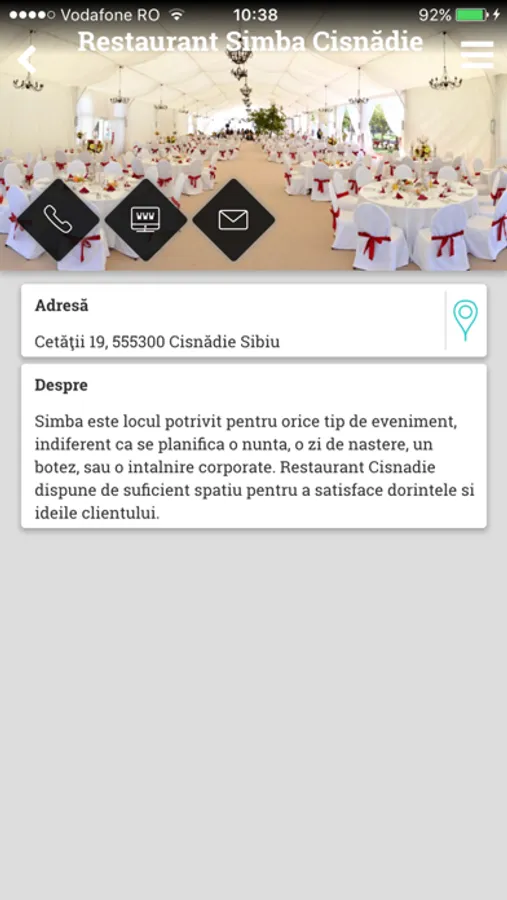 Toate punctele de interes contin detalii precum: imagini, text, adresa, telefon/telefon mobil cu posibilitatea de apelare directa, adresa de email cu posibilitatea de a trimite mesaj folosind functia email a telefonului, website, orar, locatie pe Google maps si optiuni de navigatie.