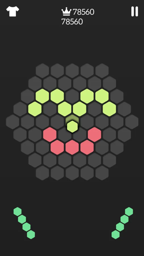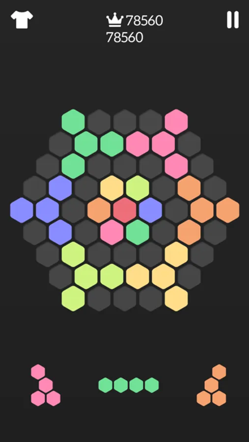 Drag the random hexagon combination onto a hexagonal chessboard. Fill a straight line in either direction of the board (horizontal, left oblique, right oblique) to eliminate the score and eliminate multiple lines. You can get extra points bonus.