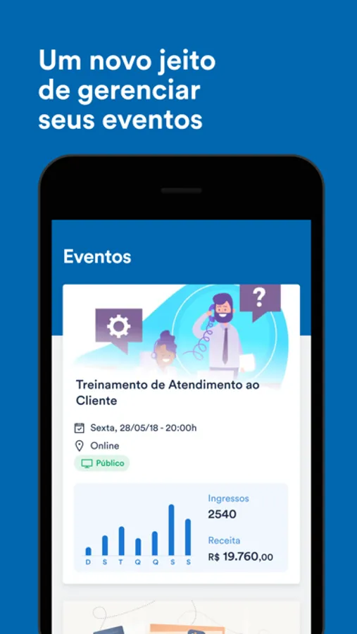 Tenha acesso às principais informações dos seus eventos, de maneira rápida e simplificada. Acompanhe suas vendas e relatórios financeiros com muito mais detalhes, tudo com gráficos para facilitar a gestão do seu evento.