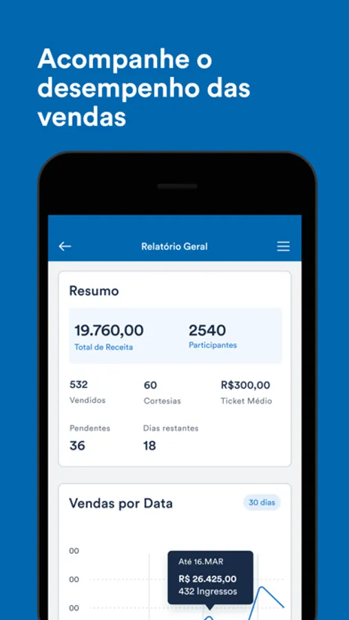 - Acessar o painel de vendas dos eventos, com gráfico de vendas por dia e detalhe por produto