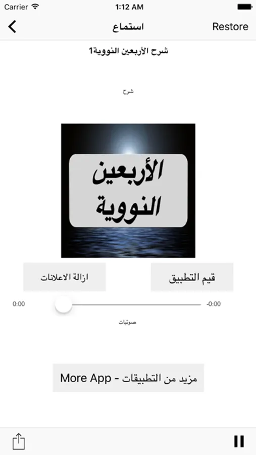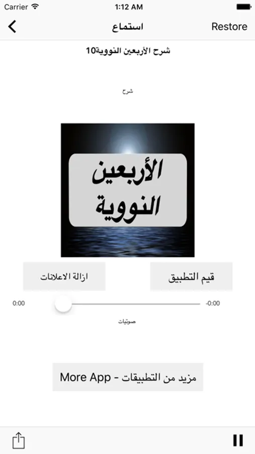 The app contains all the hadiths from the Nawawi's Forty (الأربعون النووية) book with audio explanations.