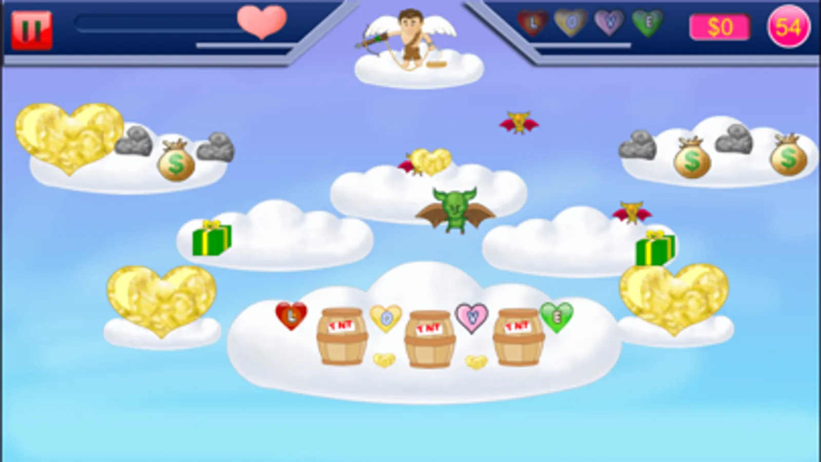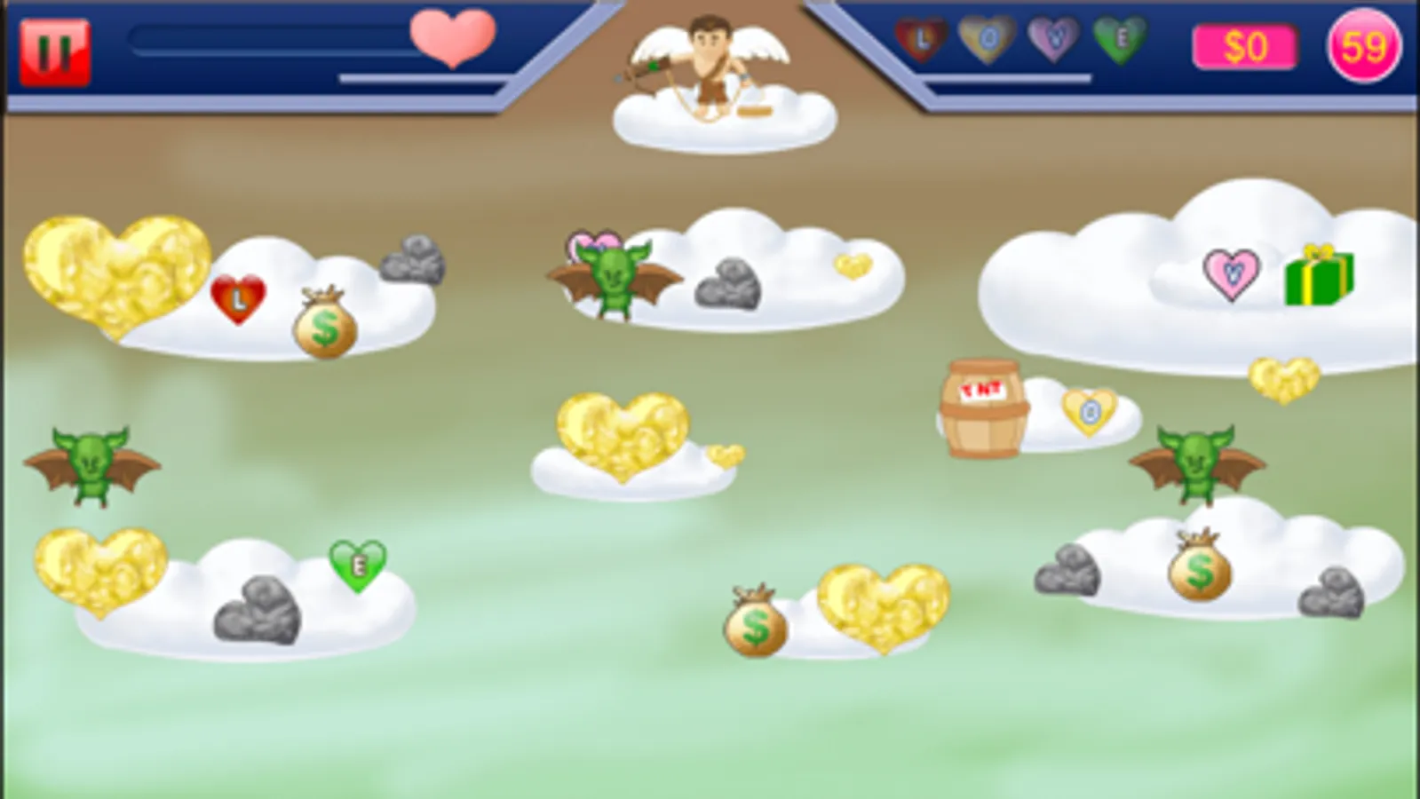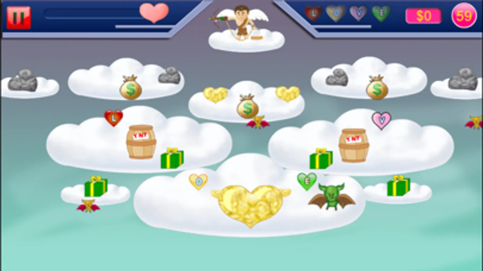 Use your crossbow to grab heart and other treasures out of the sky as Gold Miner. Tap screen to lower it. Once it has grabbed something it will pull it up on special gold miner version. Heavy objects like rocks and large love nuggets will be harder to pull up. Grab bags contain random amounts of money, a strength power-up, or a stick of dynamite. Between levels you can buy items that can help you as Gold Miner.