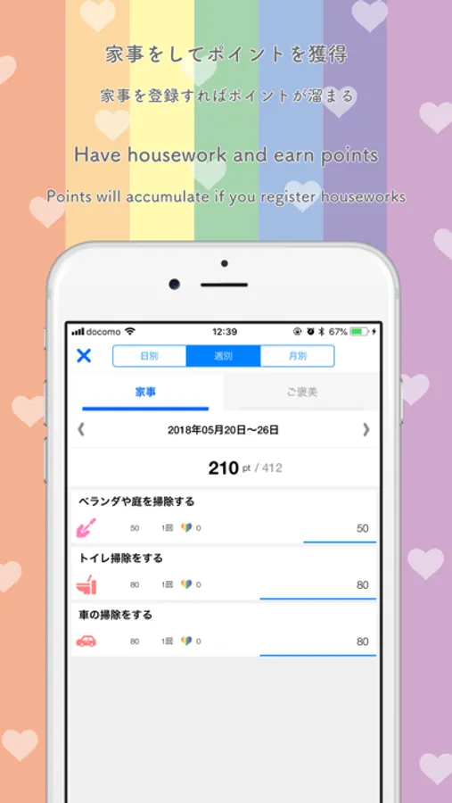 You can check earned points by housework at any time by day, week, month.