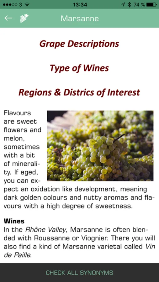 Dry, sweet, or sparkling? White or red? The 200+ Wine Grapes app will tell about the types of wine that commonly is produced with each grape, and if there are regions or areas that could be of special interest.