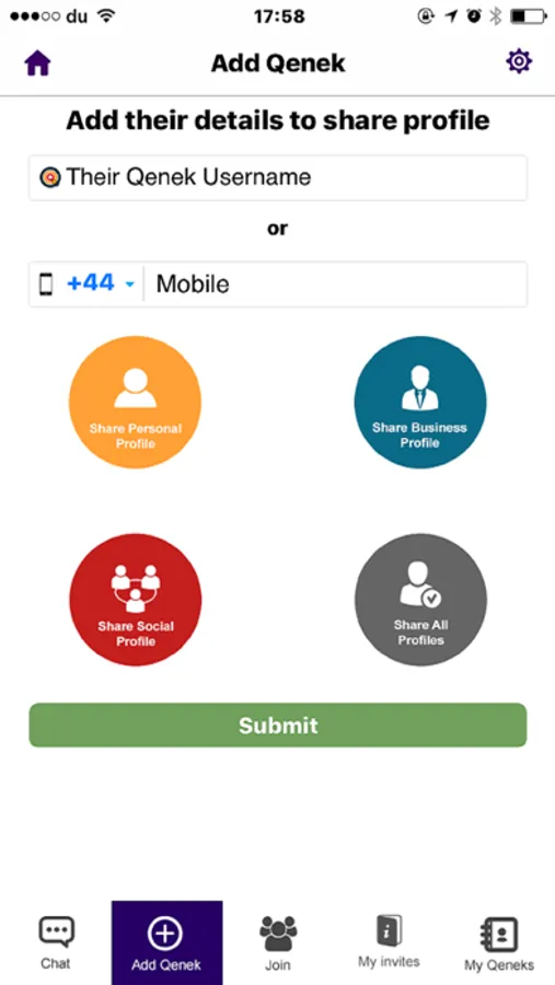 - Instant sharing of the Qenek app with others incorporating a chosen profile
