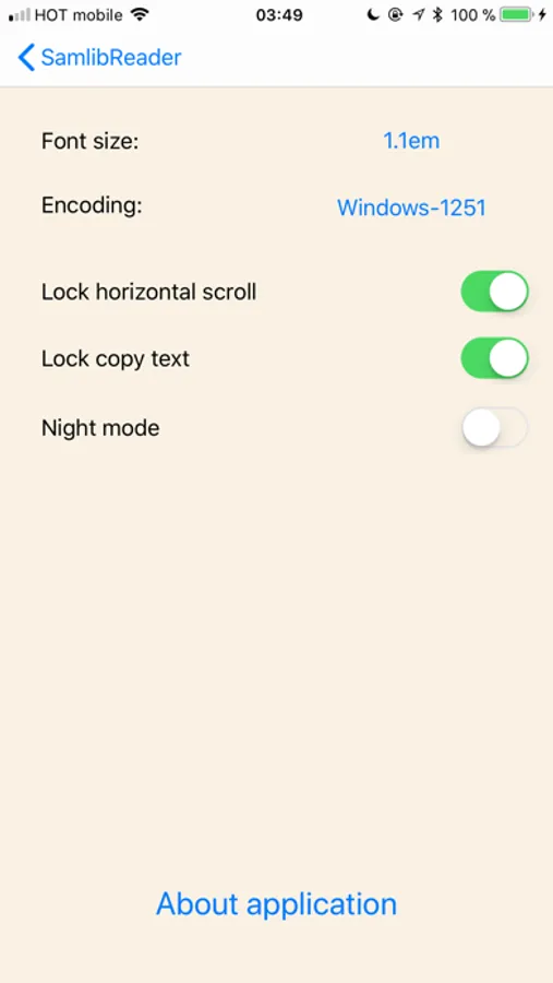 The app allows you to choose the encoding and font size, and stores a list of books and a reading position.