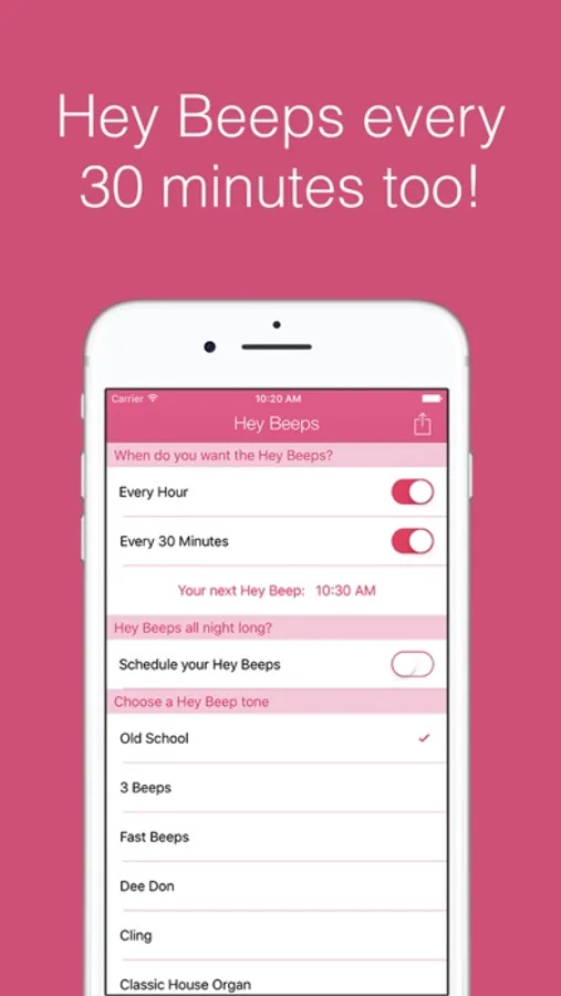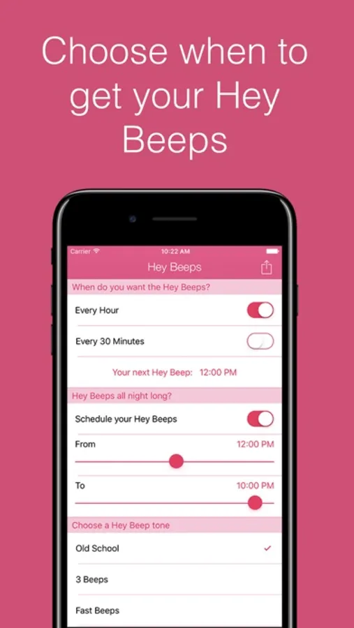 You can choose if you want a Hey Beeps alert every hour or every 30 minutes. There are different beep tones to choose from and you will be able to select when to start and stop the beeps so they won't disturb your sleep.