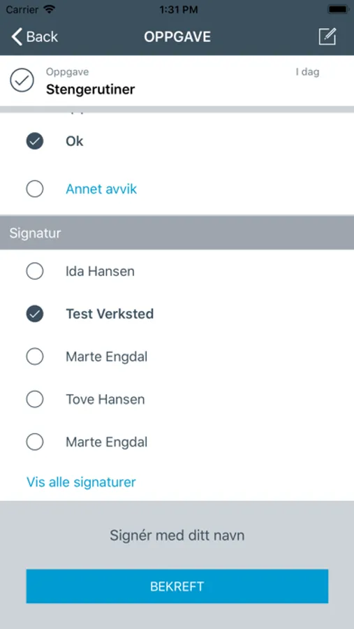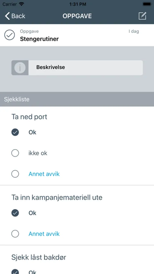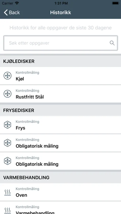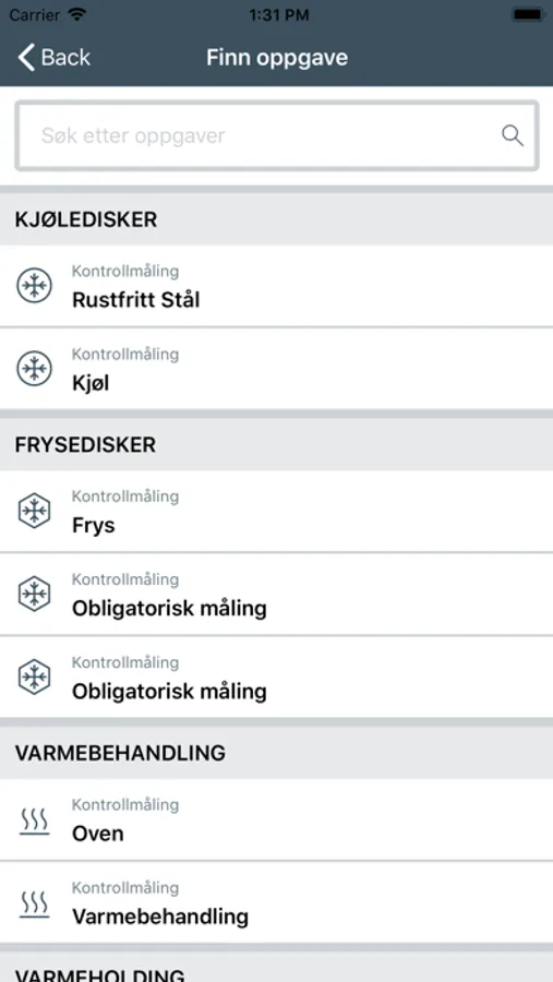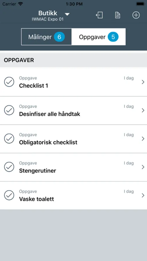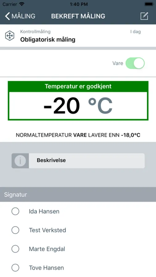 Dagens oppgaver tilknyttet temperaturkontroll kommer automatisk opp på skjermen. Målingene gjennomføres og eventuelle avvik må lukkes. Man veiledes gjennom oppgavene og signerer ved avkryssing når en oppgave er gjennomført.