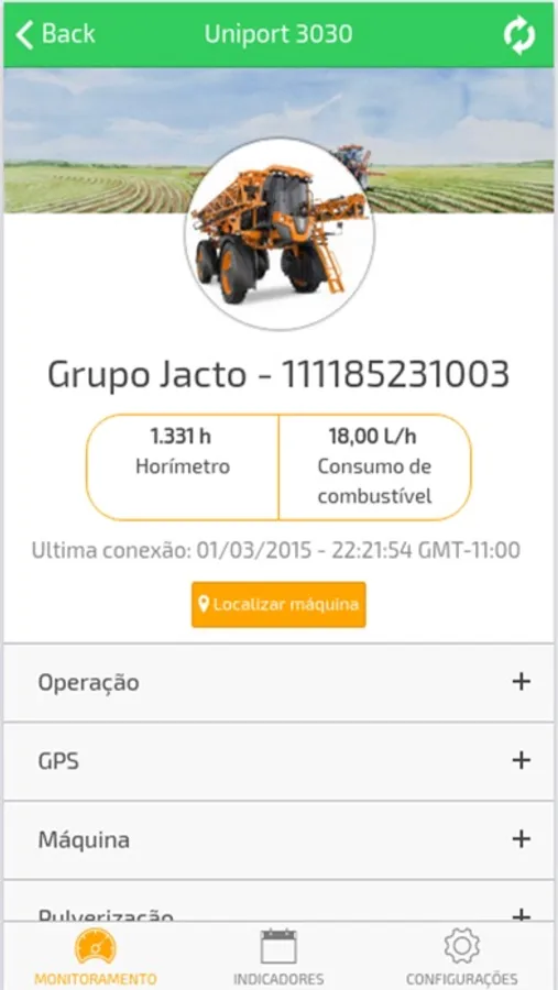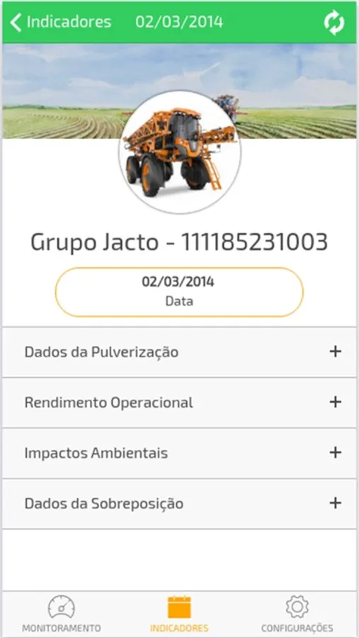 • Indicators - Check the operations performed by a Jacto engine, with information of how this was achieved, coverage and overlap spraying.