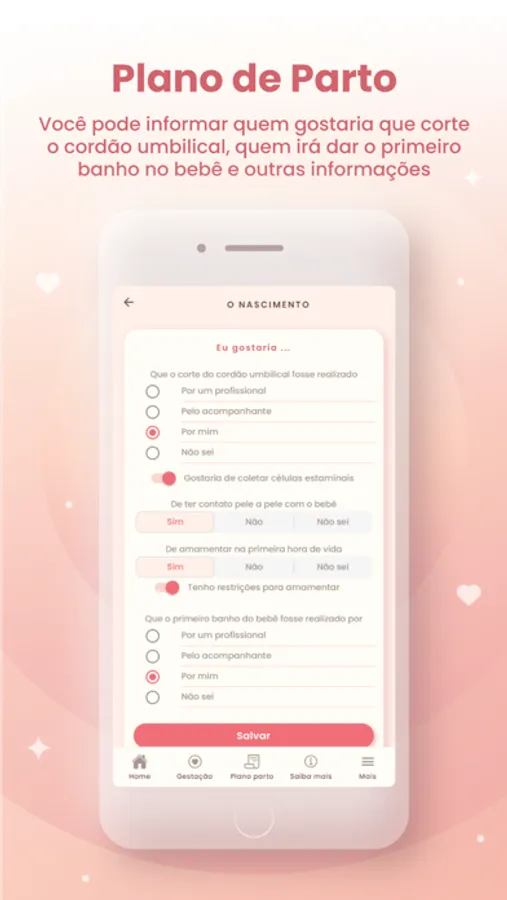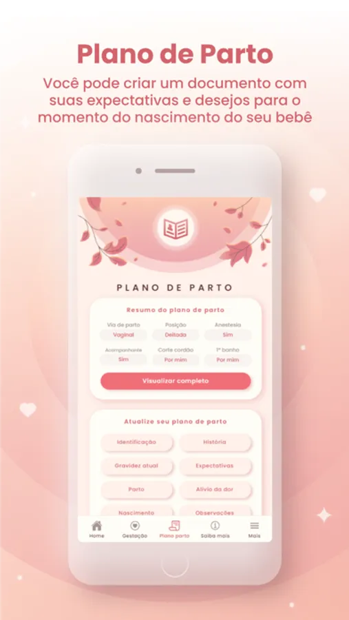 Planeje seu parto e registre suas preferências no plano de parto para compartilhar com sua equipe de saúde tanto durante as consultas de pré-natal quanto com a maternidade.