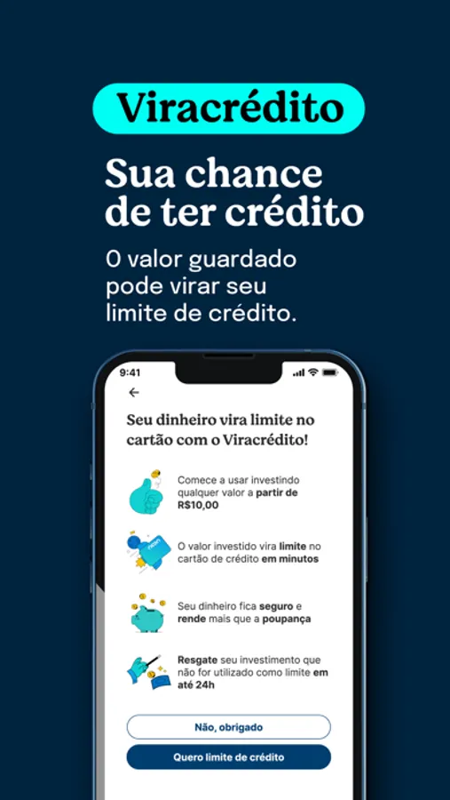 É um pacote completo de serviços financeiros para você construir seu futuro brilhante. E, claro, caso precise de alguma ajuda, conte com um atendimento disponível 24h. Você pode acessar a nossa FAQ no site e também entrar em contato conosco por e-mail, chat no app e redes sociais.