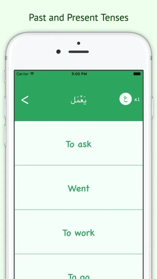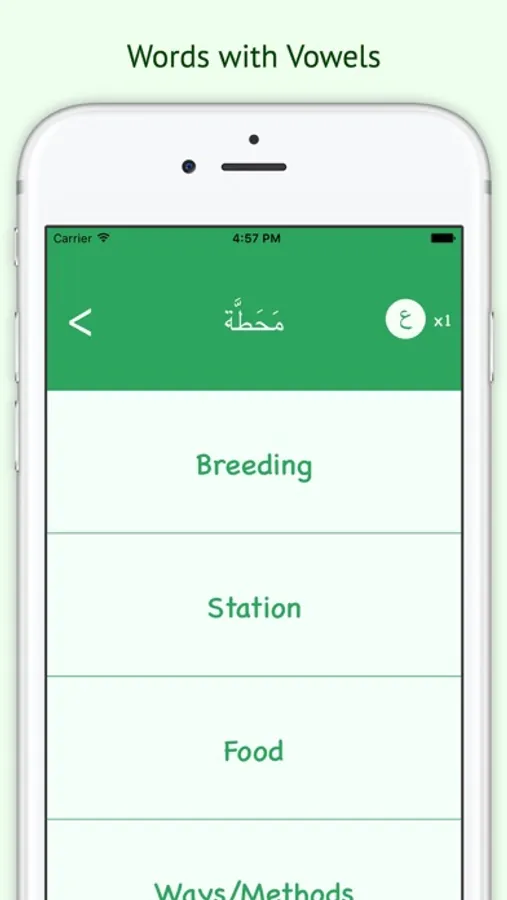 This is an app design to help memorise Arabic vocabulary. There are four types of vocabularies, nouns, verbs, adjectives and adverbs in the game. The Arabic word is given and the correct English meaning of that is to be selected from four English words . Every correct answer gains one credit while every mistake causes a delay of one second.