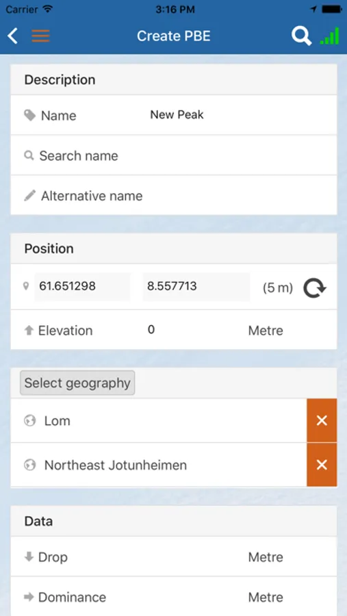 Information on peaks and other points of interest from Peakbook is easily available within the app. And if you come upon a point of interest that is missing it can easily be added.