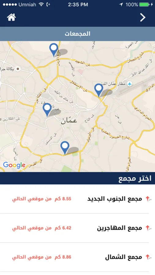 - عرض المسافة بين موقع الحالي للمستخدم و المجمعات عن طريق الاقمار الصناعية