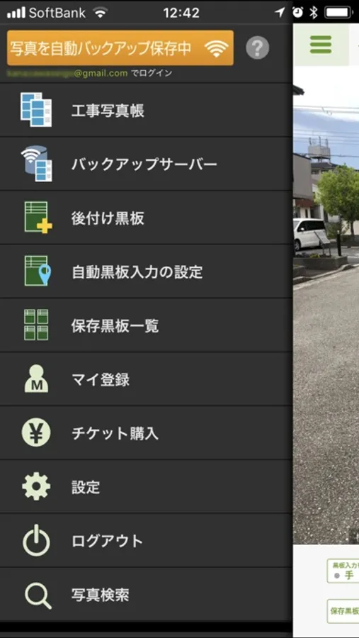 カメラロール、工事写真帳、バックアップサーバーのいずれかから写真を選択でき、選択した写真に黒板をはめるという機能です。黒板の内容を間違えた時に間違えた黒板の上にかぶせることで修正もできます。ただし、この機能は合成写真扱いになりExif情報が付与しませんので公共工事提出用の写真として使えません。