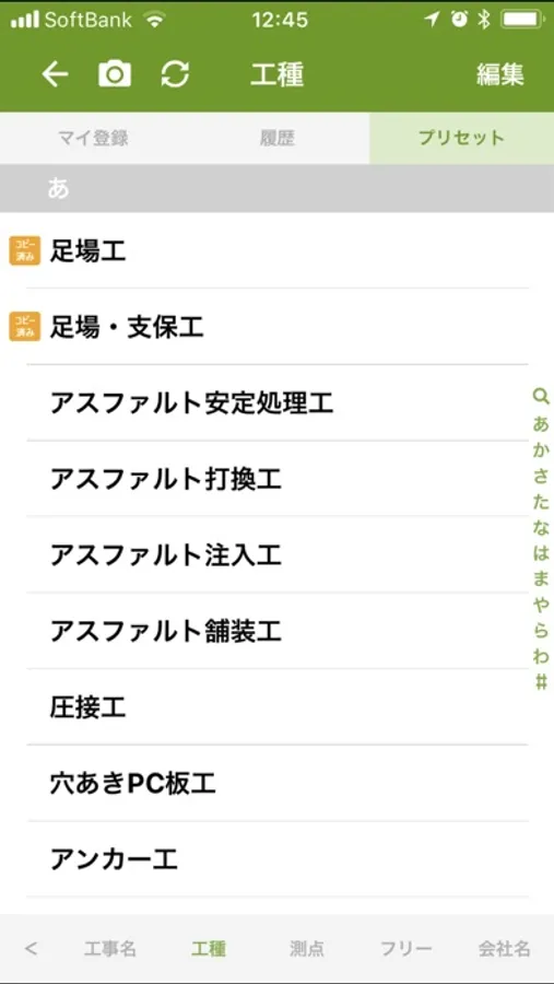 また、予め用意されたリストの中にない場合で、何度も使う工種や、測点、状況の文言などは自分で登録することも可能です。工事名、会社名なども登録が可能です。