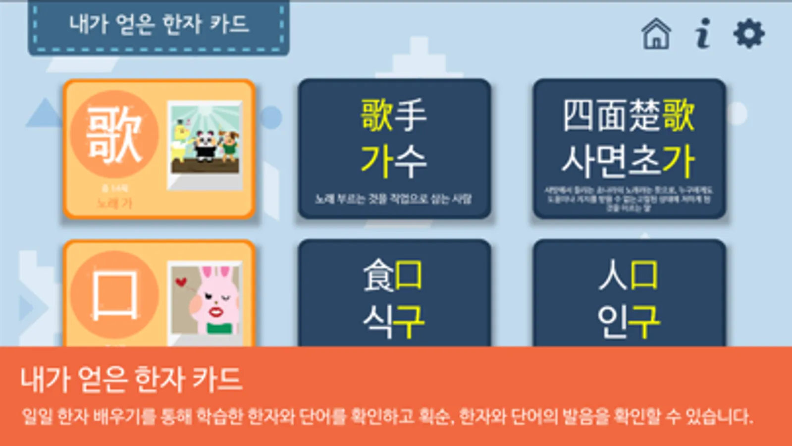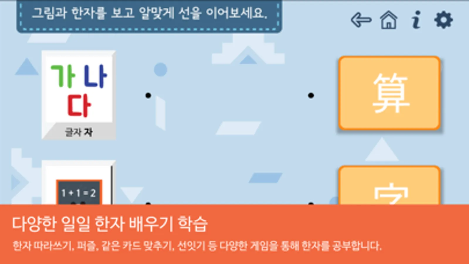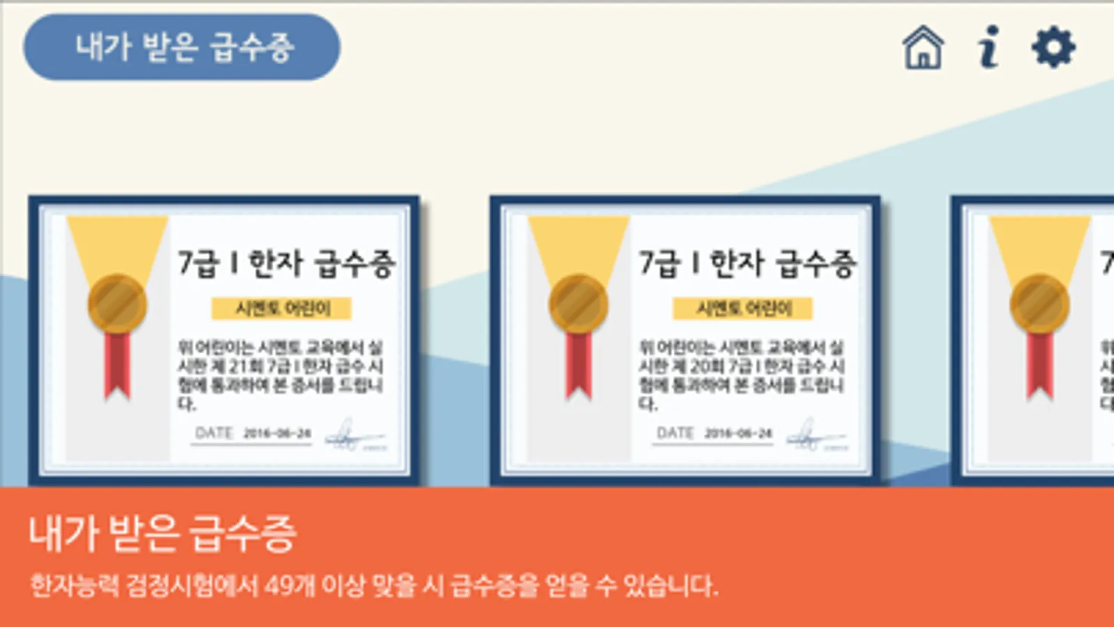 퍼즐, 한자 맞추기, 따라쓰기, 같은 한자 선택 등 재미있는 게임을 통한 한자 학습이 가능하며, 모의 시험을 제공하고 있습니다.