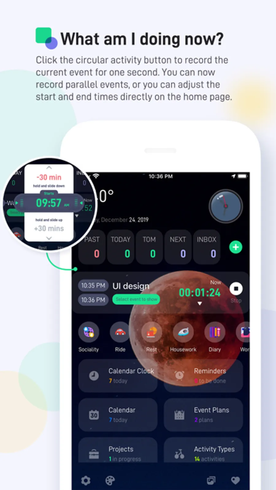 You can record or plan your day's schedule in 30 seconds by simply clicking on the preset activity icon.