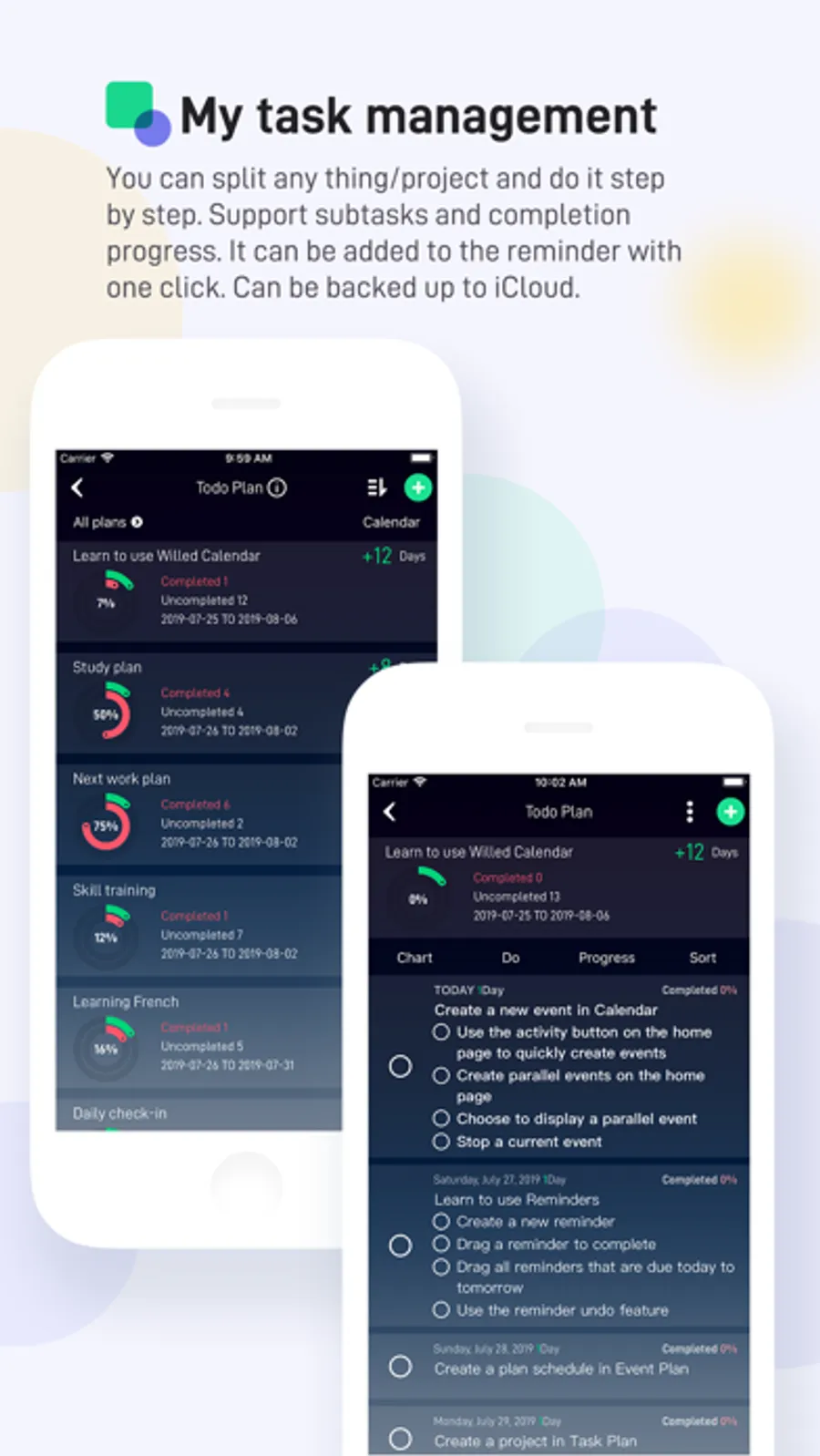 Willed Calendar allows you to use the system's calendar and reminders in one app, as well as project management (view progress and add subtasks), event planning, chart summary and other useful features, is a great tool for your management time.