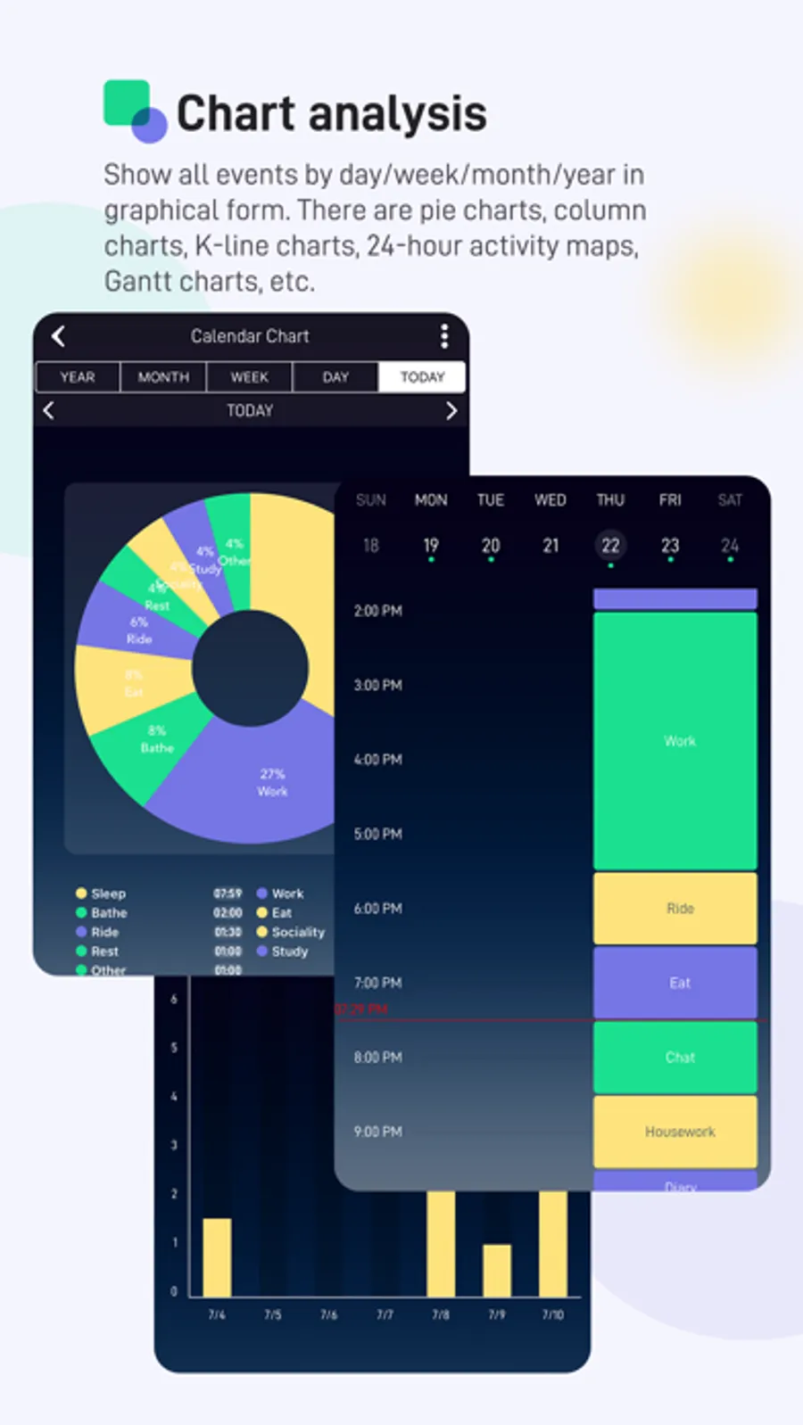 Show all events by day/week/month/year in a variety of charts. There are also time analysis trends such as activity time trends and 24-hour time distribution. Professional chart analysis allows you to see where your time is, master your own efficiency peak hours, and understand your behavior.