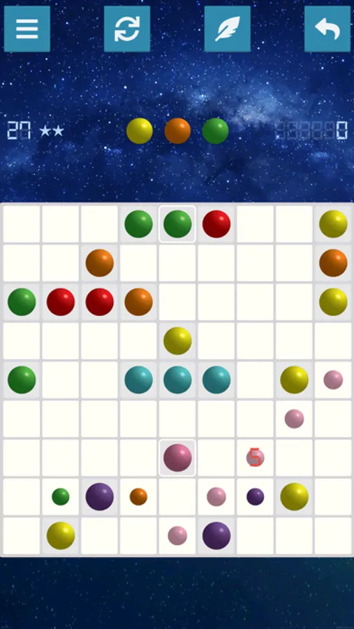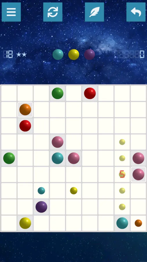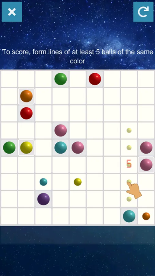 This fun and addictive logic puzzle game features a grid that is filled with colorful balls. Move one ball per turn to attempt to make a line of at least 5 same colored balls. If no such lines are created, three new balls will be spawned. If the board fills up, the game is over.