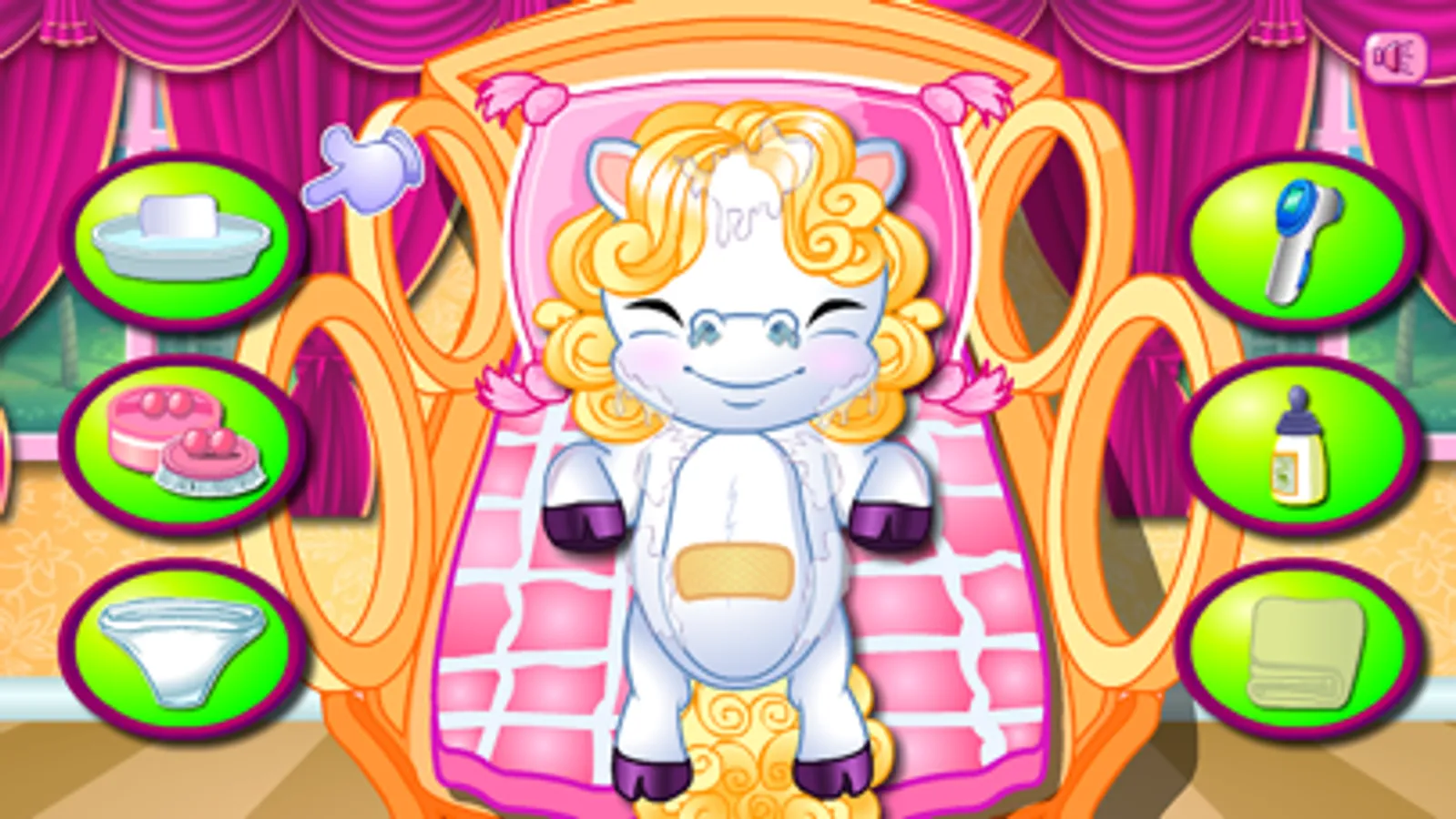 Congratulation it is a baby pony. Take care of baby pony. First check her weight. You are doing well. Now clean baby pony with soft cloth and warm water. Take soft cloth and gently clean baby pony’s nose, but remember don’t hurt her. Apply baby powder on baby pony. You are really good pony doctor. Now take diaper and change baby pony’s diaper. Just to take extra care please checks baby pony’s body temperature. Fantastic you did great job. Now check the baby’s body temperature. Take eye drop and put drops in baby pony’s eye.