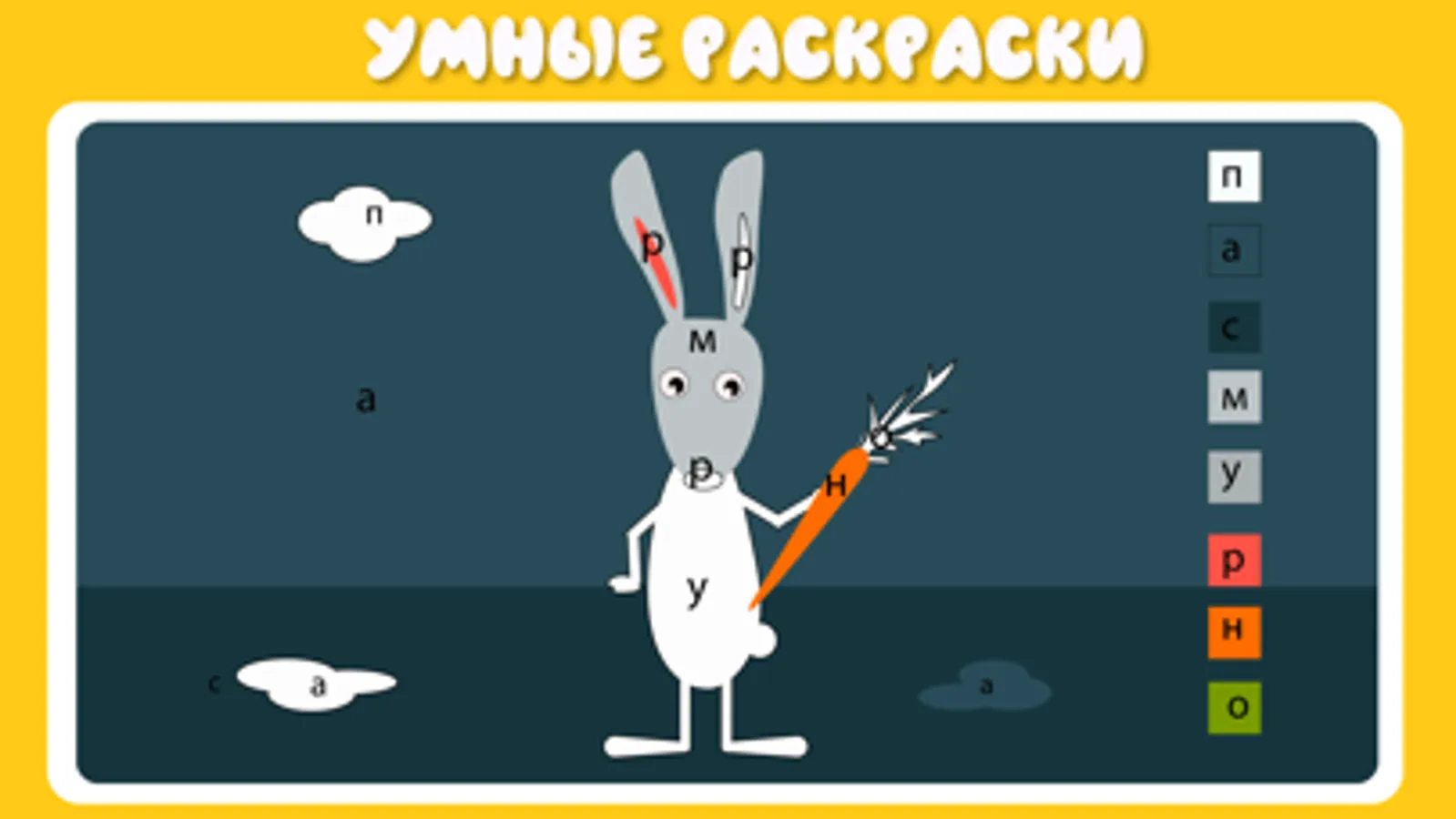 В третий блок детской игры добавлены умные раскраски со знакомыми персонажами. Каждую картинку нужно раскрашивать, используя буквы русского алфавита. Попробуйте сами поиграть в эту увлекательную игру вместе с малышом.