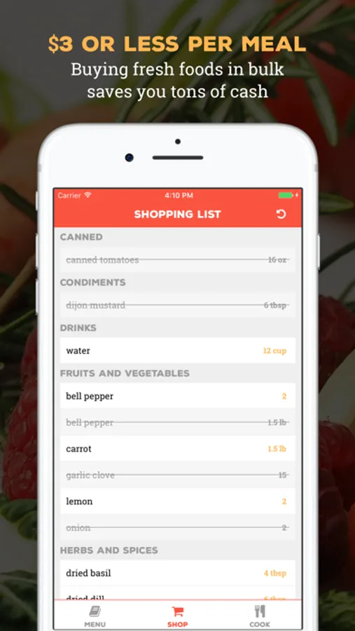 • Shop in no-time since our app tells you exactly what to buy. You'll save tons of cash from buying everything in bulk.