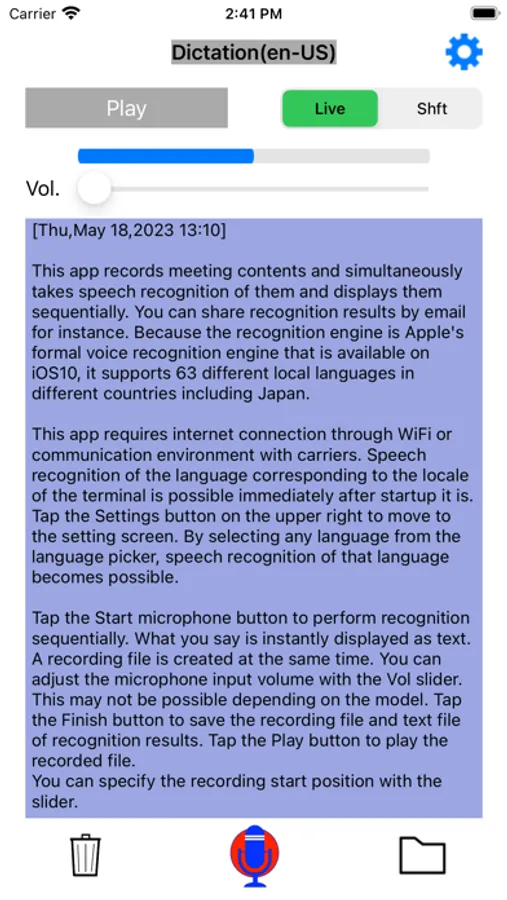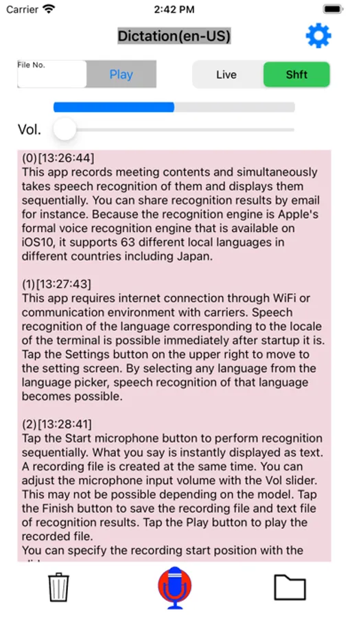 This app records dictation/meeting contents and simultaneously takes speech recognition of them and displays them sequentially.