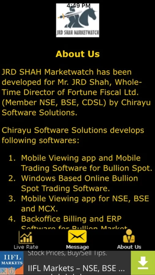 JRD SHAH MarketWatch app provides market rates of different asset class like Shares, Commodities, Bullion and Currency for the benefit of general public at large.