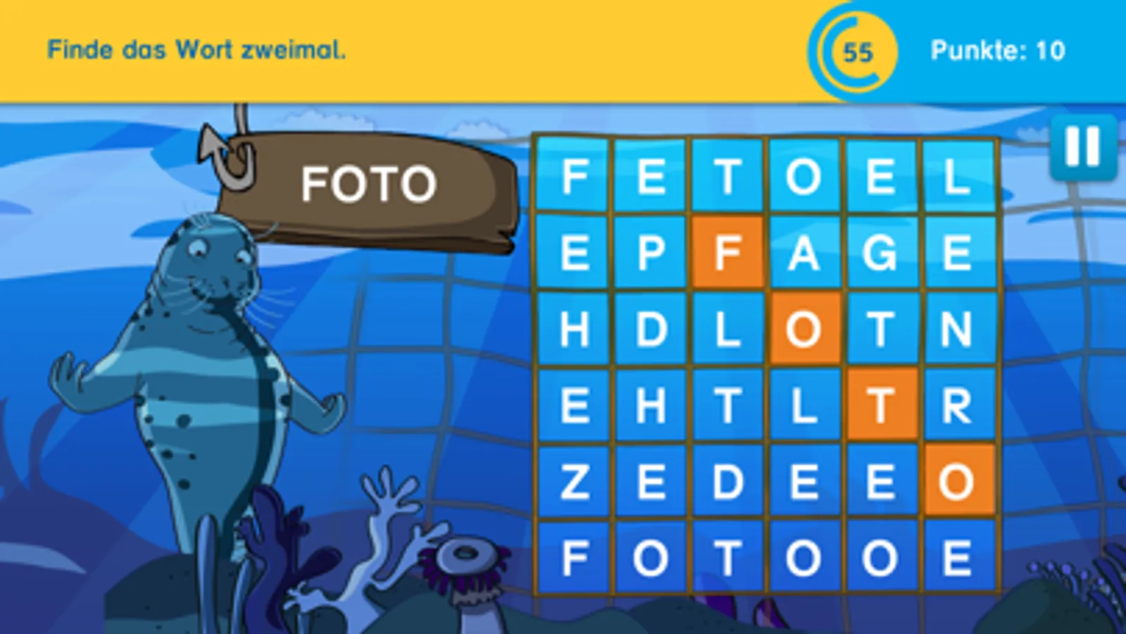 In einem Buchstabenfeld soll möglichst schnell das gesuchte Wort zweimal wiedergefunden werden.