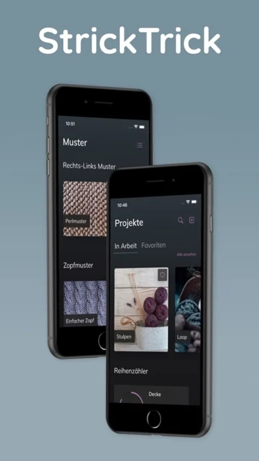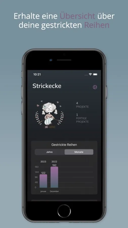 Save your projects, link documents and create row counters. Select knitting patterns from the pattern library and make your knitting even more exciting. With the row counter you have the opportunity to know how long you have knitted for a project and in your overview you can see how many rows you have knitted in one month or a year.