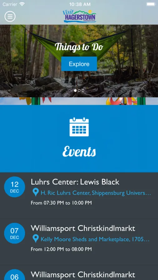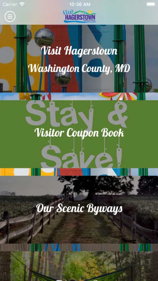 The Visit Hagerstown app includes everything you need to live, work, and play in Hagerstown and Washington County, MD; all conveniently bundled into one powerful, easy-to-use app. Stay connected with local news, a continuously updated calendar of events, and an interactive list of things to do and see.