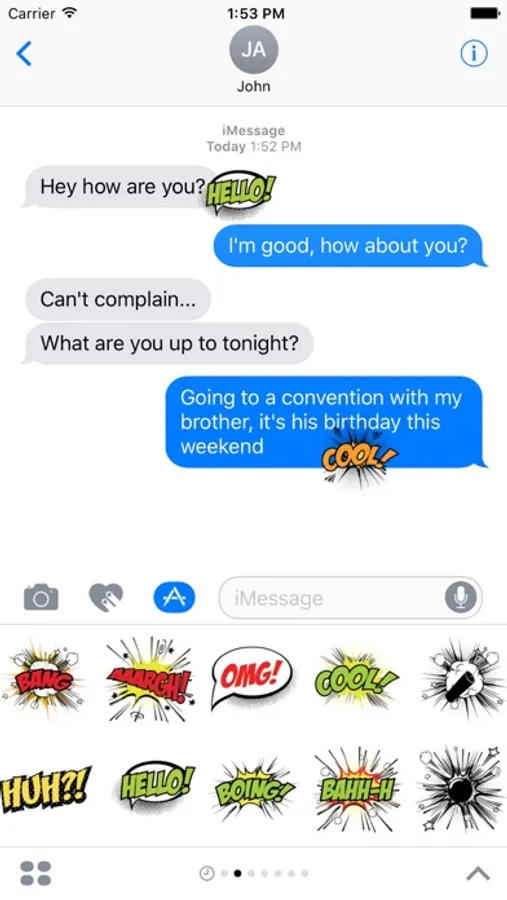 Comic Book style stickers for use in iMessages. The first eight stickers are free to use as much as you want, forever. Or you can unlock over 80 comic book style stickers in this set!