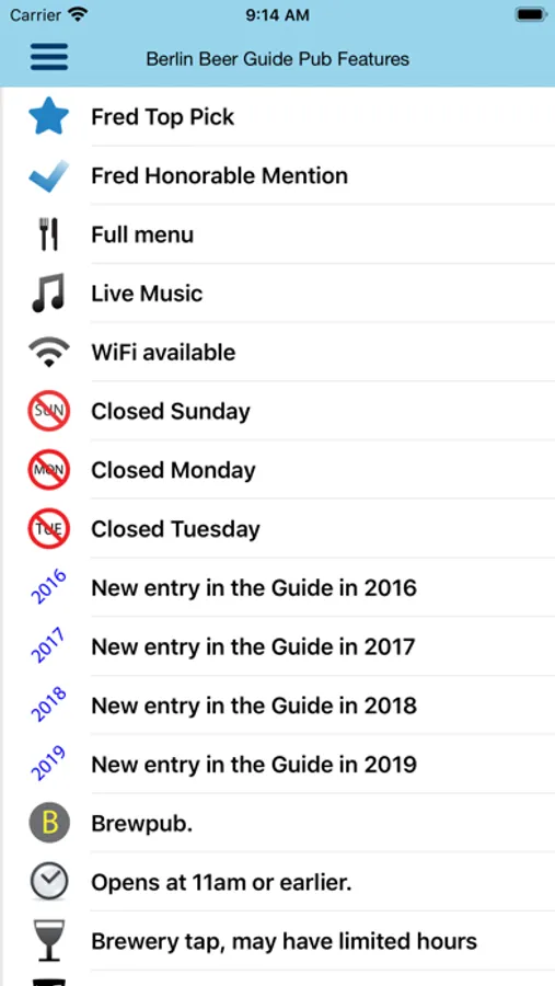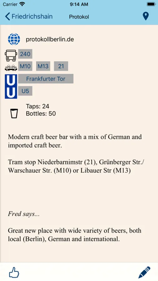 Each entry contains a review, photograph, nearest tube or mainline rail station, contact info, website and twitter handle for each pub. Check the pub's twitter feed for news without leaving the app. A map will show the location of the pub as well as nearby listed pubs.