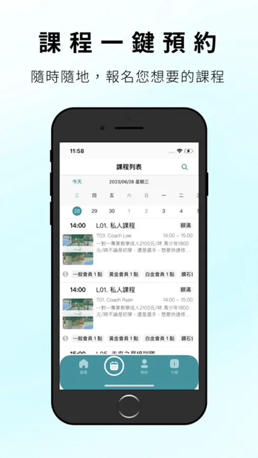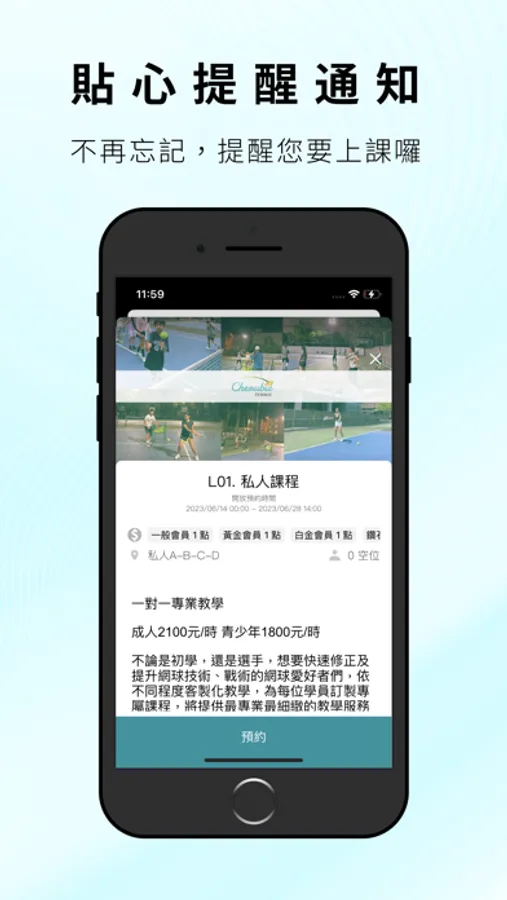 網球不只是網球,更是生活的一部分,由你來創造無限可能! Cherubic Tennis教學特色: -美式系統網球教學 -國家隊&國際教練資歷師資 -初學快速入門 -初學進階對練配對教學 -各階段選手風格塑造&問題點調整 網球課程: -一對一教學 -一對二教學 -團體教學 -企業包班 預約課程步驟: 1.查看課程模式 2.進入課程預約畫面 3.預約成功