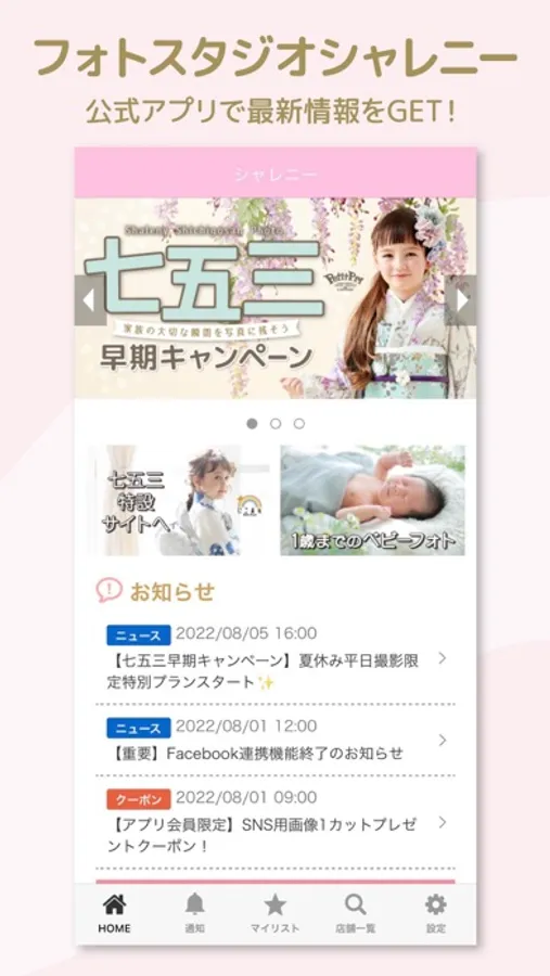 フォトスタジオシャレニーの最新情報とお得なクーポンが届く、嬉しいアプリ!