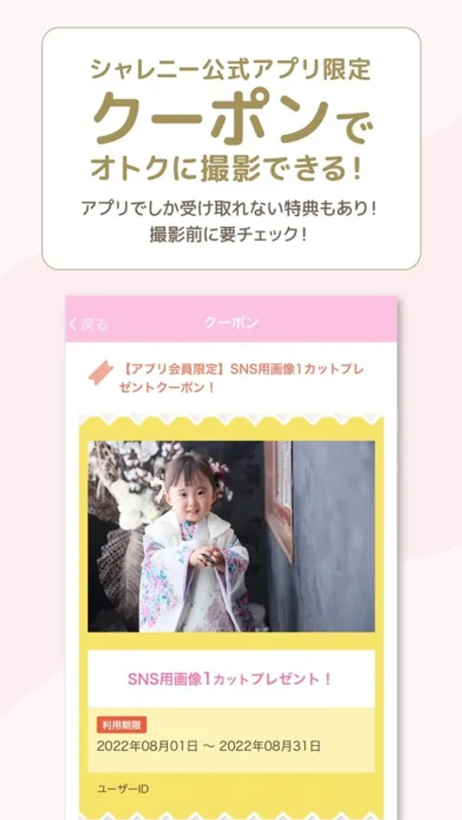 オトクに撮影できるクーポンをGETできます。アプリでしか手に入らないクーポンもあるのでお見逃しなく!