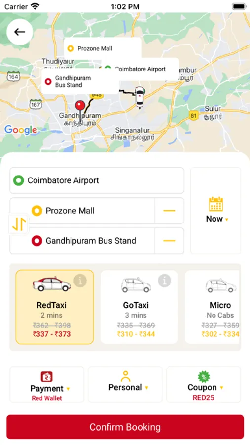 Red Taxi is available in Coimbatore, Tiruppur, Erode, Salem, Trichy, Madurai and Dindigul. See the upcoming list of cities where we operate at redtaxi.co.in