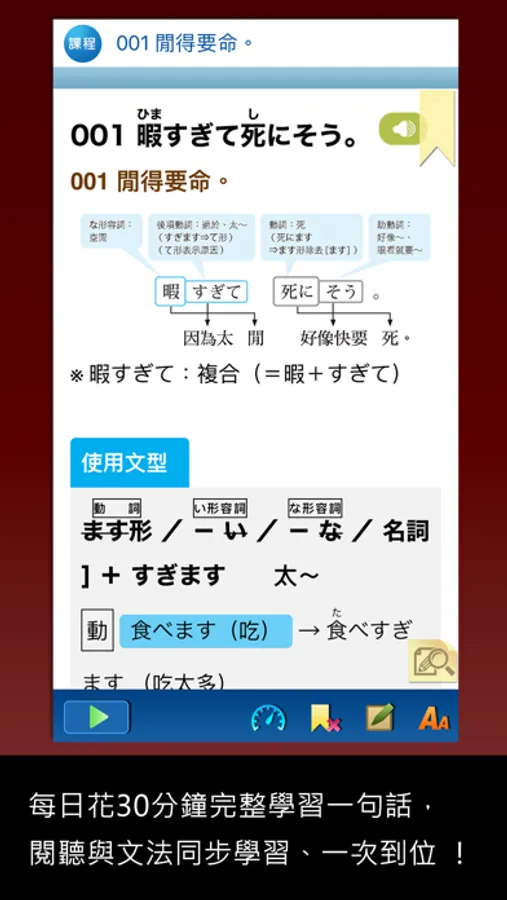 「花30分鐘完整學習一句話所隱含的規則性文法」,並掌握「適時、適地、適人」的使用時機,達成「深入、完整」的有效學習。